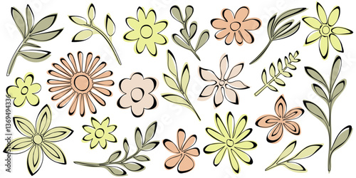 Hand drawn plant elements, flowers and leaves, vector design