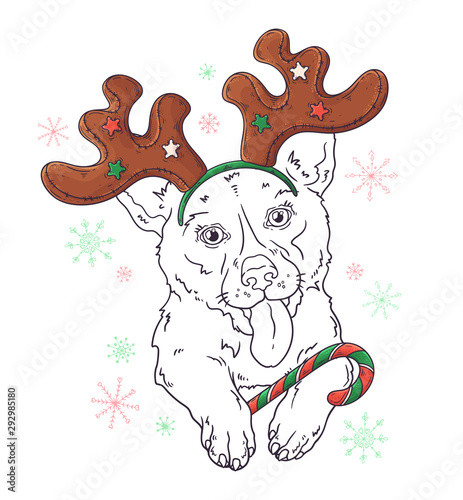 Hand drawn portrait of corgi dog in Christmas accessories Vector.