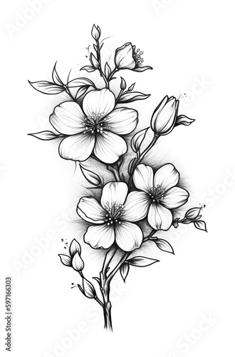 Hand drawn sketch of a branch with flowers. Generative AI.