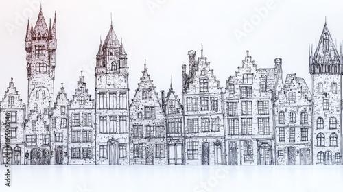 Hand drawn sketch of a European cityscape with tall buildings and towers.