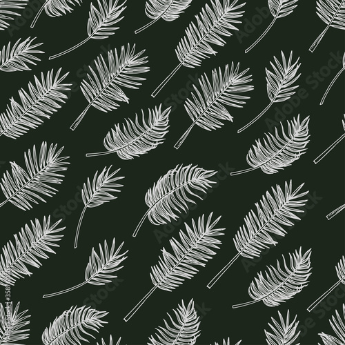 Hand drawn sketch style palm leaves on dark background seamless pattern. Color illustration with tropical leaves.