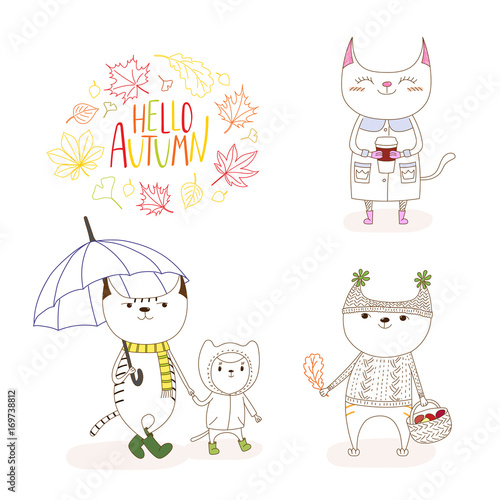 Hand drawn vector illustration of cute cats, in rain coat, with umbrella, mushrooms, paper cup, with wreath of leaves and text Hello Autumn.