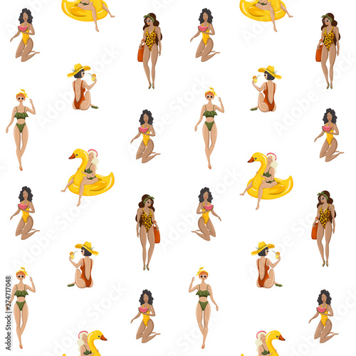 Hand drawn vector seamless pattern background with cartoon women. Summer time people. Vector EPS 10
