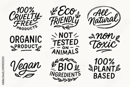 Hand drawn vegan, cruelty-free, and eco friendly product label badges set. Vector labels collection