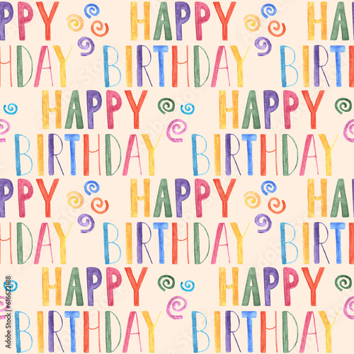 Hand drawn watercolor seamless pattern made of handwritten celebrating words "happy birthday" on beige background with multicolored confetti.Party backdrop