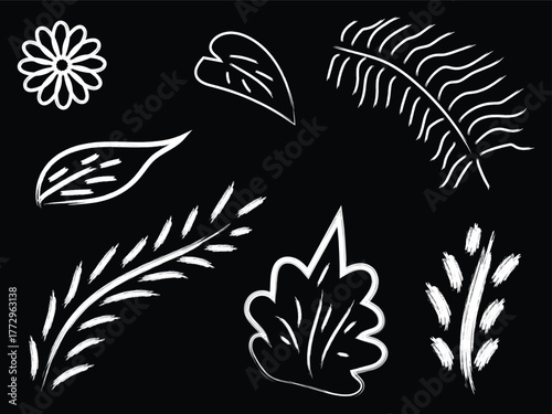 hand drawn white botanical leaves and flower doodles on black background, minimalist floral line art elements in sketch style, abstract nature illustration with simple brush stroke foliage design