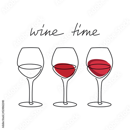 Hand drawn wine glasses vector with text. Wine Time handwritten lettering. One line continuous phrase, quote, slogan. Design for print, banner, wall art, poster, card.