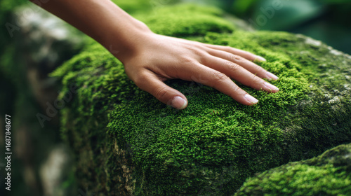 Hand gently touches vibrant green moss on textured stone surface, showcasing beauty of nature and connection between humans and environment