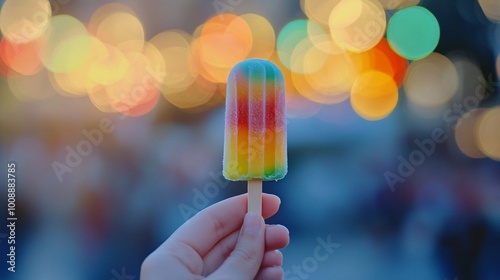Hand Holding a Colorful Ice Cream Popsicle with a Bokeh Background.