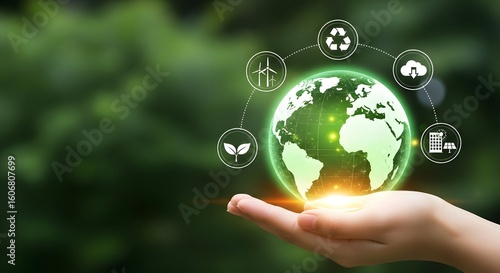 Hand holding a glowing green Earth with technology and nature icons. Concept of ESG, environmental social governance, and sustainable development.