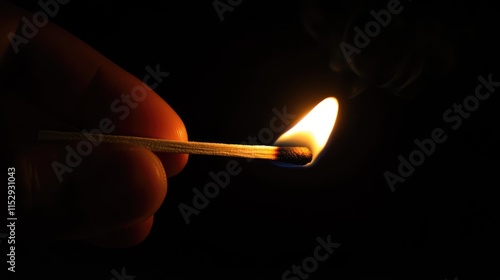 Hand holding a lit match against a dark background highlighting its flame and wooden stick structure with a focus on ignition and light production