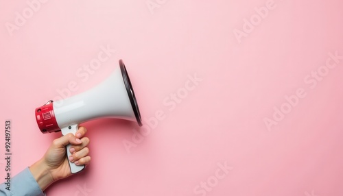 megaphone, hand, pink, background, speaker, announce, communication, alert, news, message, broadcast, attention, white, red, holding, arm, talk, speech, volume, plastic, noise, express, inform, advertise, propaganda, public, shout, notice, left, signal, human, pale, technology, equipment, tool, hand-held, call, arousal, command, yell