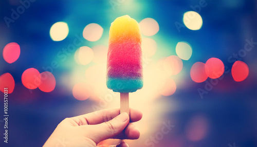 Hand holding a Popsicle of Colorful Ice Cream on a Bokeh Background