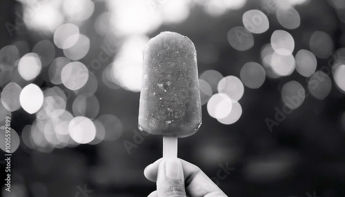 Hand holding a Popsicle of Colorful Ice Cream on a Bokeh Background