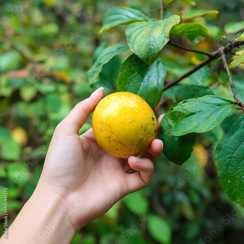 Hand holding a ripe, yellow fruit against a background of lush green leaves in a natural setting. Fruit is almost perfectly round in shape.