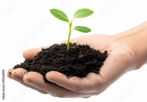 Hand holding a small plant or small tree for giving life to the earth, isolated on white background. Concept of conservation, planting, sustainability, environmental and ecology