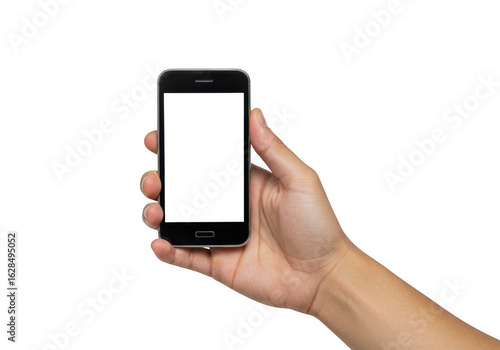 hand, holding, smartphone, phone, mobile, device, technology, communication, touch screen, screen, blank, empty, person, human, finger, thumb, grip, isolated, transparent, background, cut-out, digital, contraption, wireless, app, cyberspace, user, interface, display