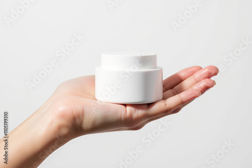hand, holding, white, cosmetic, jar, bottle, cardboard box, product, beauty, skincare, health care, medicine, container, glasses, plastic, empty, blank, design, template, branding, marketing, advertising, studio, photo, professional, clean, minimal, simple, elegant, luxury, premium, feminine, soft, pure, natural, organic, environmentally friendly, sustainable, cream, skin, isolated, hand