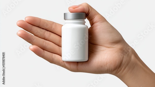 Hand holding a white pill bottle. The bottle is empty and the hand is holding it. Concept of responsibility and care for one's health