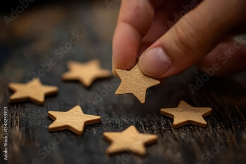 Hand holding a wooden star above other stars on a dark textured wooden surface close up view