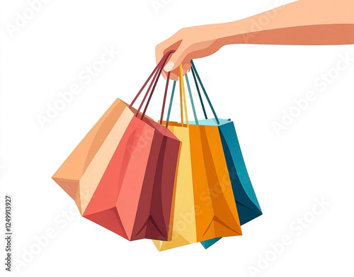 Hand Holding Colorful Shopping Bags Illustration on White Background graphic representation of consumerism
