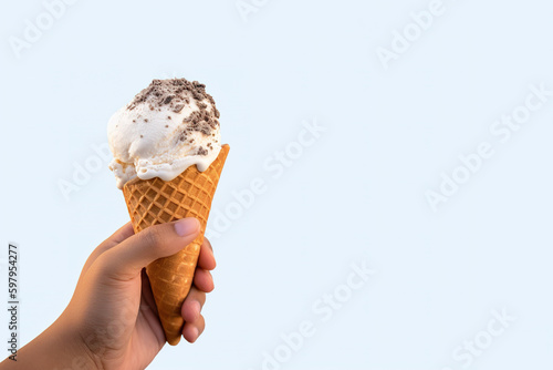 Hand holding delicious cookies and cream ice cream in a crispy waffle cone with copy space. Created with Generative AI Technology