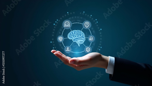 Hand Holding Holographic Neural Processing Unit (NPU) Icons: AI & Machine Learning Symbols Representing Advanced Neural Computing in a Conceptual Photo Stock Image
