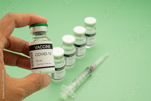 Hand holding of Covid-19 vaccine in a glass bottle with vaccine bottles and syringe placed on a green background for prevention, immunization, and treatment from coronavirus infection
