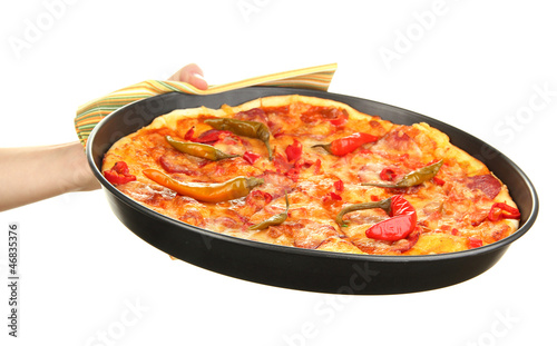 hand, holding, pizza, pan, isolated, white, calorie, cheese, circle, clothes, cook, cooked, cooker, crunch, delicious, delivery, diet, dinner, eat, fast, fattening, food, epicure, ham, hold, hot, ravenous, ingredient, italian, italy, lunch, meal, meat, melted, mozzarella, napkin, nourishment, oily, onion, oven, pepper, red, eatery, round, sauce, sausage, snack, tasty, tomatoes