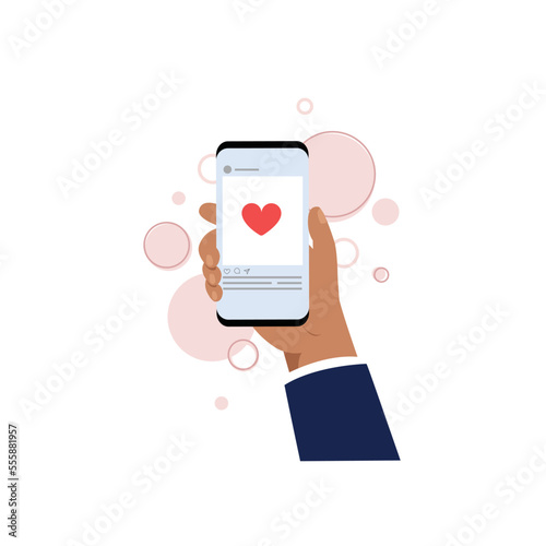 Hand holding smartphone with Likes and hearts, Social media and marketing concept.