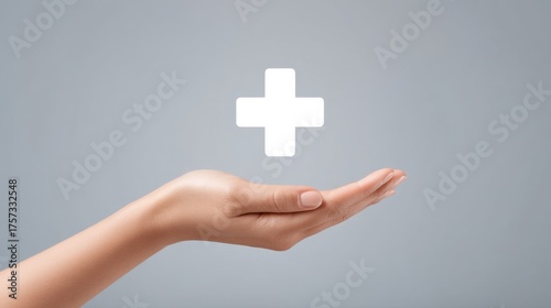 Hand Holding Symbol of Health Care with Plus Sign on Gray Background Concept of Medicine and Wellness for Health Promotion and Support