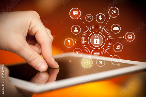 Hand holding tablet with online security concept