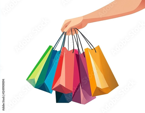 Hand holding vibrant shopping bags illustration on a clean white background showcasing retail therapy