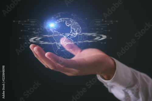 Hand holding virtual Global Internet connection metaverse. Digital transformation technology strategy, IoT, internet of things. enhancing global business capabilities. Ai
