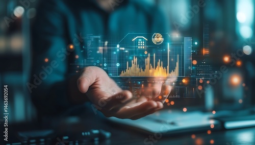 datum, analysis, finance, financial, graph, chart, business, technology, digital, futuristic, interface, screen, hologram, virtual, projection, hand, holding, illustration, bokeh, abstract, modern, concept, visualisation, future, investment, market, growth, economy, information, network, communication, connection, artificial intelligence, ai, statistic, information technology, trading, exchange, property, real estate, house