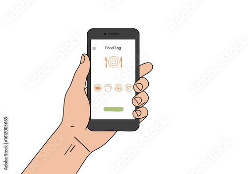 hand holds a smartphone displaying a food log app A hand holds a smartphone showing a daily log interface Modern clean design lifestyle health tracking