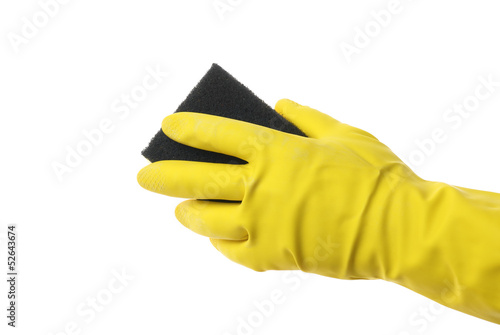 Hand in rubber glove with sponge isolated on white