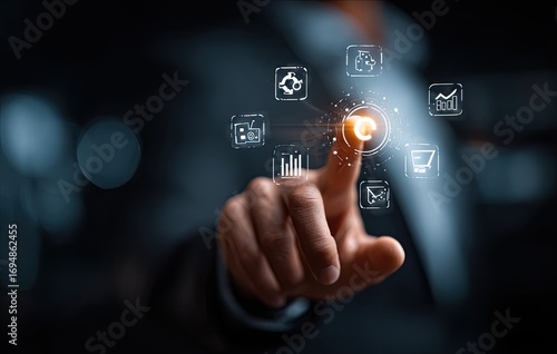 hand, finger, touch, interface, digital, virtual, screen, technology, business, modern, graphic, overlay, icon, application, datum, information, analysis, management, growth, strategy, planning, marketing, commerce, sale, client, service, communication, productivity, innovation, design, future, interaction, control, display, light, glow, businessperson, dark, background, blurred, insight