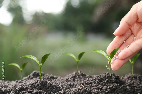 hand of a farmer giving fertilizer to young green plants / nurturing baby plant with chemical fertilizer on green bokeh background