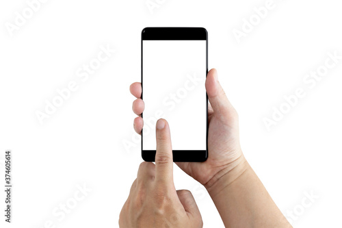 Hand of a white man holding a black smartphone and a white screen at a isolate background with clipping path.