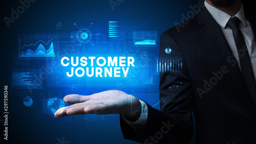 Hand of Businessman holding CUSTOMER JOURNEY inscription, business success concept