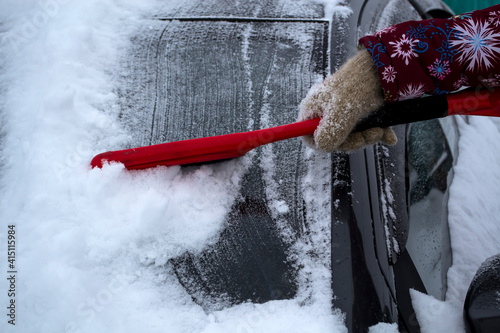Hand of woman using brush and remove snow and ice from car and windscreen, concept of transportation and winter