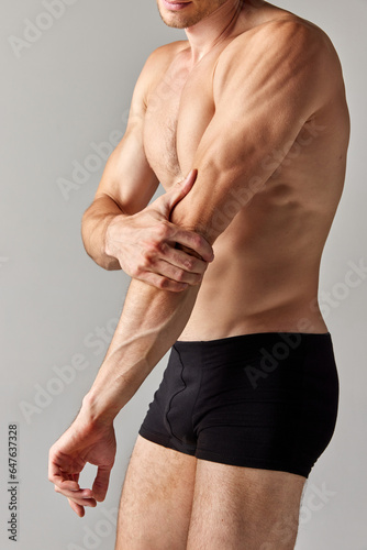 Hand pain, sprain. Cropped image of muscular man with relief body in underwear holding elbow against grey studio background. Concept of men's health and beauty, body care, fitness, wellness, ad