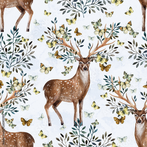 cervid, reindeer, buck, animal, antelope, seamless, pattern, butterfly, bush, leaf, watercolor, art, artwork, background, beautiful, decoration, design, drawing, hand, illustration, male, nature, paper, poster, realistic, vignetting, grunge, texture, wild, wildlife, wood, young, antler, painted, forest, tree, shrub, spotted, tree branch, floral, hipster, aquarelle, romantic, drawn, chaplet, garland, paint, natural, style