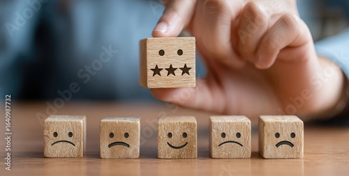 Hand placing a 5-star wooden block among blocks with various facial expressions