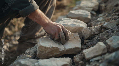 hand, stone, rock wall, construction, work, building, labor, material, nature, dirt, tool, repair, structure