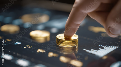 coin, gold, hand, digital, trading, finance, investment, economy, chart, datum, technology, business, currency, wealth, financial, futuristic, stock, market, growth, screen, touch screen, analysis, profit, success, money, display, economic, strategy