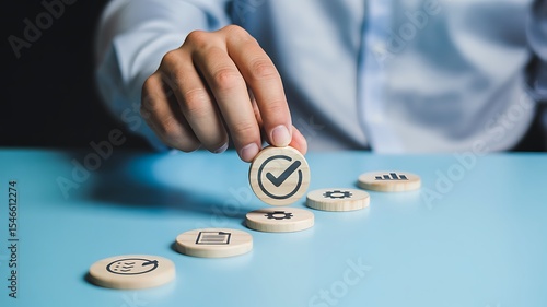hand, wooden, disc, checkmark, process, step, light, blue, surface, table, business, planning, progress, completion, success, achievement, goal, strategy, management, workflow, checklist, task, organisation, efficiency, productivity, symbol, icon, gear, document, chart, growth, development, concept, image, photo