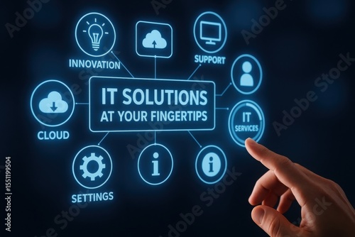 Hand pointing at digital interface with glowing icons related to IT services. Includes terms like cloud, innovation and support. Concept of information technology solutions.