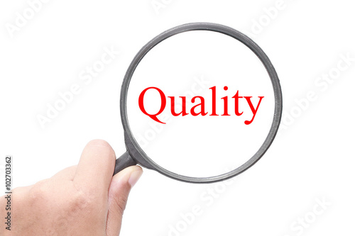 Hand showing Quality word through magnifying glass. Magnifying glass search concept. Isolated on white background.